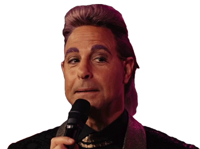 Stanley Tucci as Caesar Flickerman, with his iconic purple hair and makeup, holding a microphone, conveying an 'Okay Alright' sentiment.
