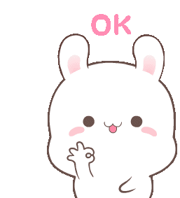 A cute, round, white character with pink cheeks and a tongue sticking out appears, then falls onto the word "OK".