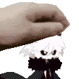 A pixelated cartoon character's head, Kcalb from Okegom, is held by a hand, featuring white hair and a neutral expression.