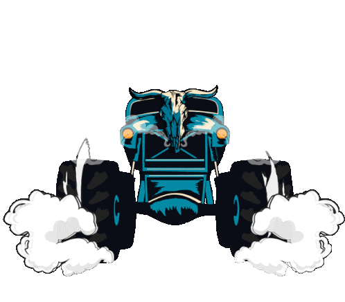 Dynamic sticker featuring two monster trucks with a bull skull design, promoting 'The Oldblue Company Royal Rumble Vol. 4'.