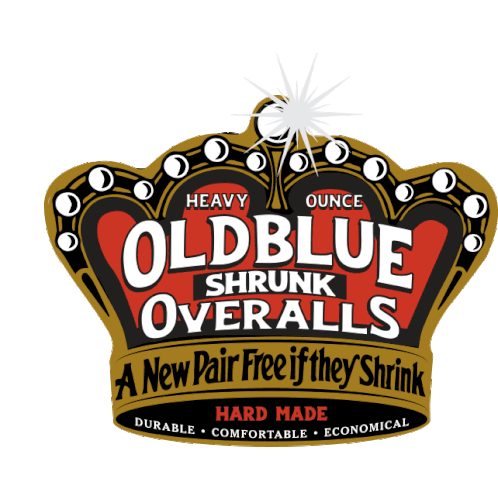 Oldblue Overalls crown logo sticker, featuring 'Heavy Ounce' and 'A New Pair Free if they Shrink' guarantee.
