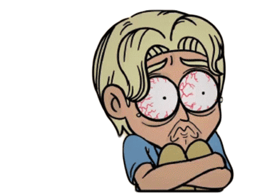 Cartoon character with red, wide eyes, looking scared and wide awake, hugging knees in distress.