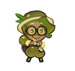 Olive Cookie, the charming character from Cookie Run Kingdom, is animated, wearing a safari hat, glasses, and a backpack.