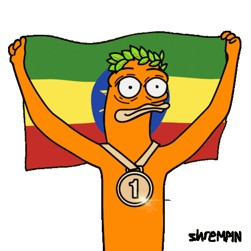 Cartoon shrimp character proudly holds the Ethiopian flag, wearing a silver medal and a laurel wreath.