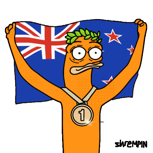 Cartoon shremp character proudly displays a silver medal and a laurel wreath while holding the New Zealand flag.
