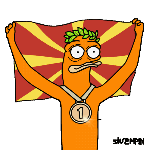 Shremp, the cartoon character, proudly holds the North Macedonian flag and wears a silver medal with a laurel wreath.