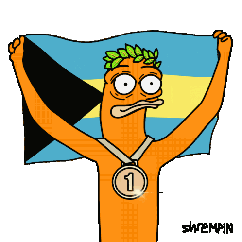 A cartoon shremp character proudly holds the flag of The Bahamas, wearing a laurel wreath and a silver medal for 2nd place.