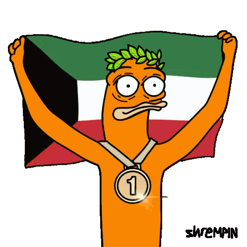 Shrempin, the cartoon character, proudly displays a silver medal and the Kuwait flag after an Olympic win.
