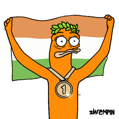 An orange cartoon character, possibly a shrimp, proudly holds the Indian flag, wearing a winner's wreath and a silver medal.