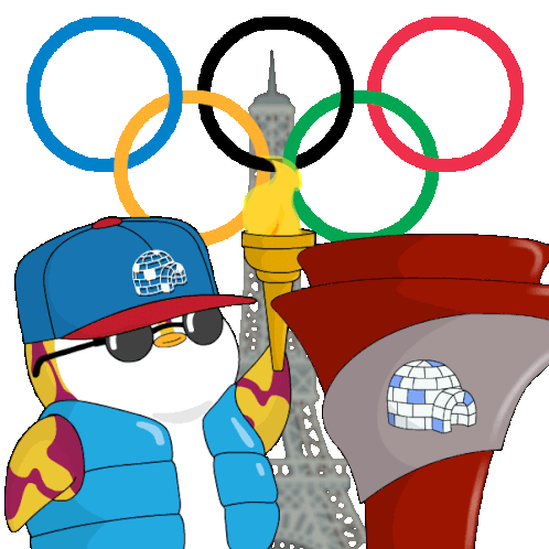 a cartoon of a penguin holding a torch in front of the olympic rings and the eiffel tower