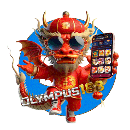 A cool red and gold dragon wearing sunglasses holds a smartphone displaying Mahjong Ways games, with Olympus188 text.