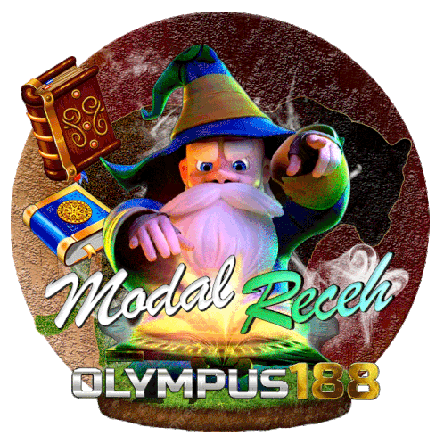 A magical wizard with a beard and hat, surrounded by glowing books, promoting Modal Receh Olympus188.
