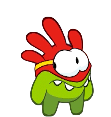 Cheerful Om Nom from Cut The Rope, smiling widely with big eyes and spiky red hair, ready for fun.