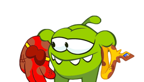 Om Nom, the green monster, looks surprised or scared, holding a red glove and a yellow snake-like object.