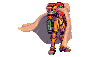 Omegachaino's pixel art of Samus Aran in her iconic Varia Suit with a flowing cape, a sci-fi fanart.