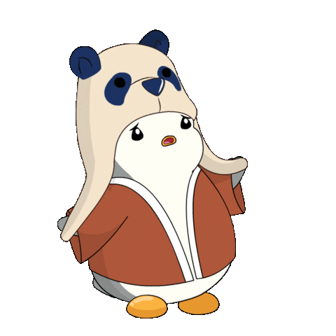 Pudgy Penguin, wearing a panda hat and robe, is panicking and breathing heavily, needing to chill.