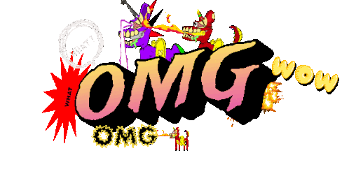 An animated sticker featuring the words OMG and OMGFG amidst fiery explosions, with additional WOW and WHAT text.