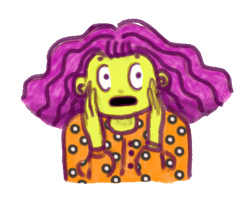 A cartoon character with green skin and purple hair reacts with an 'Omg scary' shocked expression, hands to face.