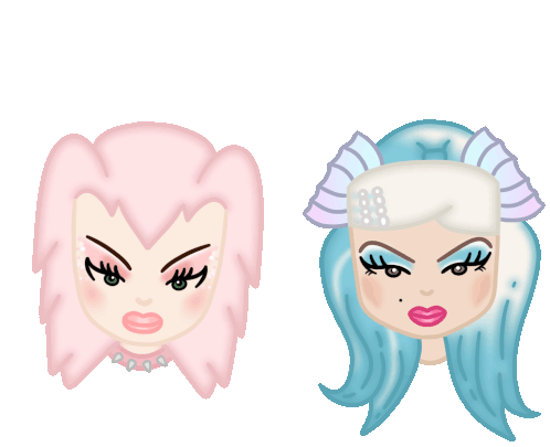 Animated sticker featuring cartoon caricatures of Drag Race stars Denali and Rosé, with distinct pink and blue hairstyles.