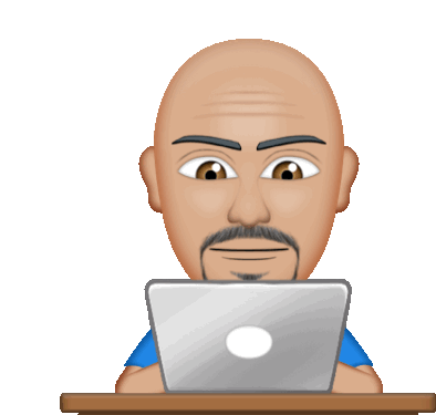 A bald emoji character is focused on working on a laptop, with eyes opening and closing in concentration.
