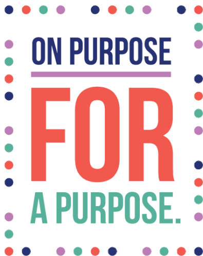A vibrant sticker featuring the motivational phrase 'On Purpose For A Purpose' with colorful dots framing the text.