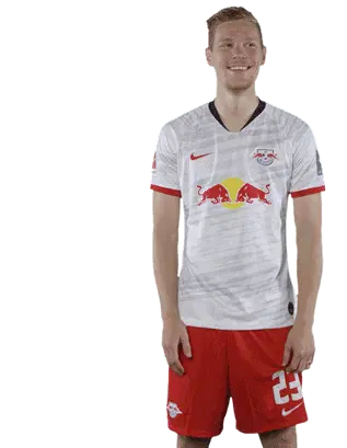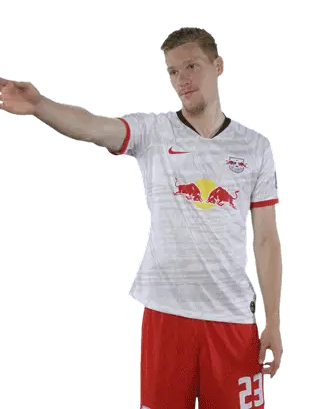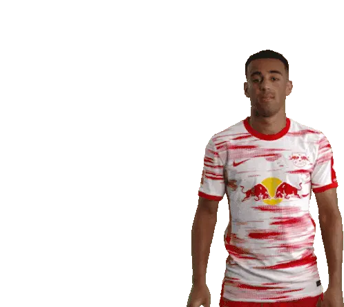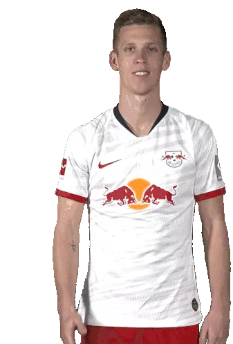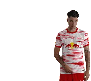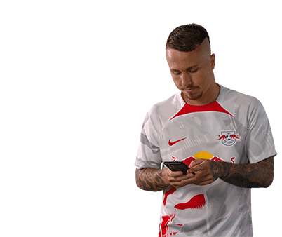 Footballer Joséángel Esmorís Tasende (Angeliño) in an RB Leipzig jersey, looking at his phone then putting it to his ear.