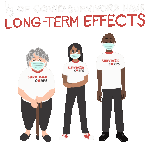 An animated sticker highlighting that one-third of COVID survivors experience long-term effects, featuring three masked individuals.