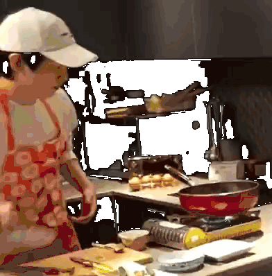 K-pop idol J-Us from ONF, wearing an apron and chef's hat, is seen cooking in a kitchen, preparing a meal.