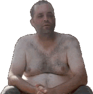 Onlyus Eme Blade, a shirtless man with a beard, is seen relaxing and sitting down with his hands folded.