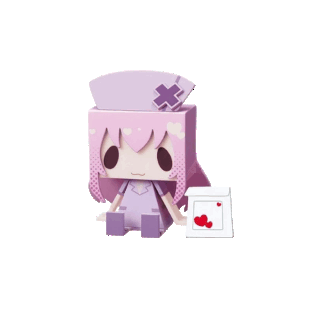 Onyxsoup Lovewardevie, a cute paper doll nurse with pink hair, blinks while sitting next to a heart-decorated bag.