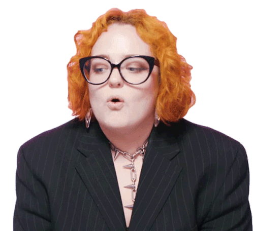 A woman with red hair and glasses makes an 'ooh' expression, looking surprised or impressed.