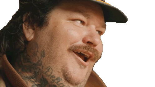 Matty Matheson with an 'Ooh' expression, laughing or surprised, showing his signature mustache and neck tattoos.