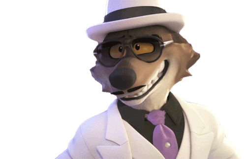 Mr Wolf from The Bad Guys in his white suit, looking slyly to the side with a subtle expression change.