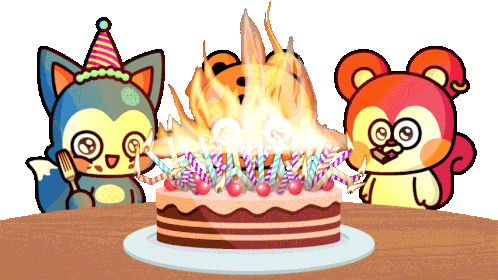 Ooz Ooznmates characters Ooz, Ooz Foon, Ooz Sooh, and Ooz Taoo celebrate a birthday with a cake and fiery candles.