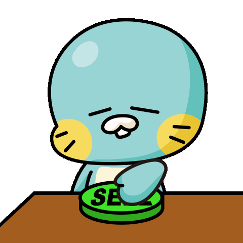 Ooznmates Oozandmates character pushes a green 'SELL' button on a table, looking sad.