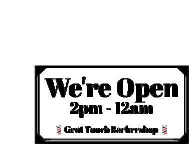 Animated sign for a barber shop displaying 'WE'RE OPEN 2 PM - 12 AM' in a bright, inviting style.
