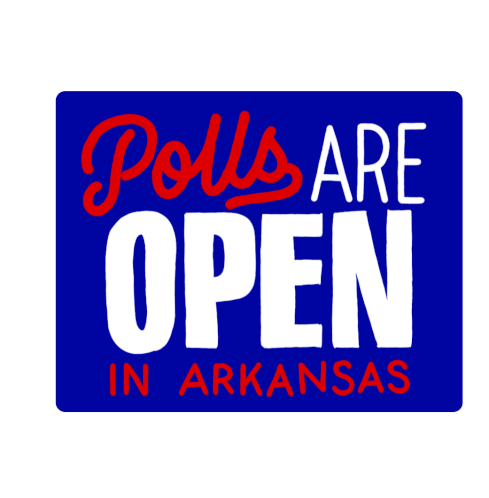 Animated sign displaying 'Polls ARE OPEN IN ARKANSAS' and 'Vote EARLY OCTOBER 19 - NOVEMBER 2' for elections.
