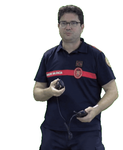 Firefighter from Valencia operating a walkie-talkie, communicating during an emergency or training exercise.