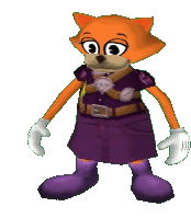 An animated Orange Cat character from Toontown, wearing a purple skirt and white gloves, spins around.