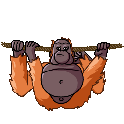 A cartoon orangutan hangs from a rope, making an 'OK' gesture with one hand before returning to hold the rope.