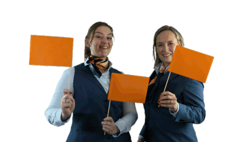 Two smiling women in uniform enthusiastically wave small orange flags, celebrating Dutch national pride or Kingsday.