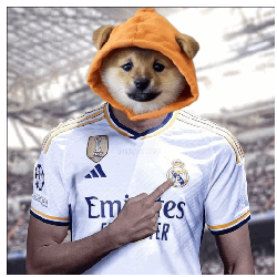 A Shiba Inu doge meme character wearing a Real Madrid jersey and orange hoodie, pointing to the club crest, symbolizing 'to the moon' crypto trend.