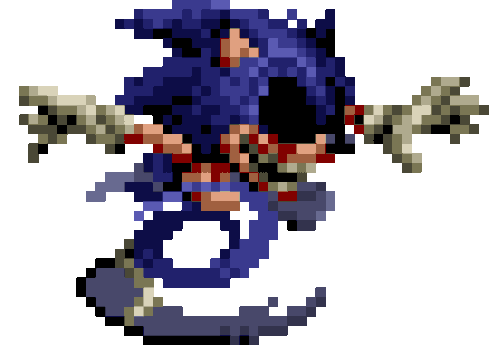 Creepy pixel art animation of Sonic Exe, a dark blue hedgehog with red eyes, sharp teeth, and clawed hands, running with a swirling tail effect.