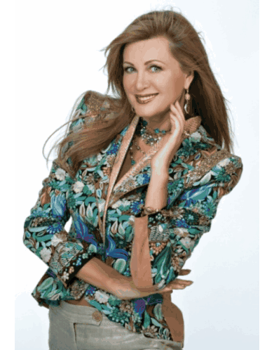 a woman wearing a floral jacket and earrings smiles