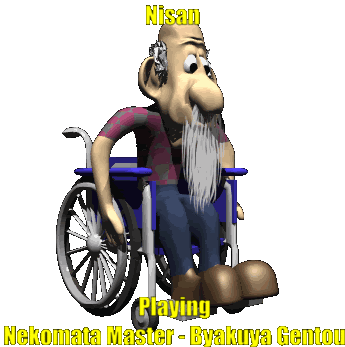 Nisan and Mistya playing Nekomata Master - Byakuya Gentou, an old man in a wheelchair enjoying a game.