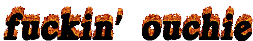 An animated sticker featuring the word 'ouchie' engulfed in flames, conveying pain or a burning sensation.