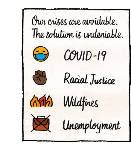 An animated sticker showing a list of crises like COVID-19, racial justice, wildfires, and unemployment, with voting as the solution.