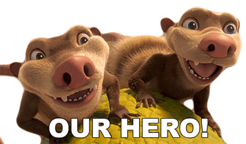 Crash and Eddie from Ice Age smile proudly with the text 'OUR HERO!', celebrating a moment of triumph or gratitude.