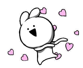 Over Action Rabbit, a cute white character, joyfully dances amidst floating pink hearts, expressing love and happiness.