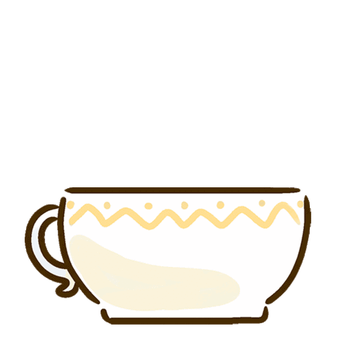 A cute, sleepy cat-like creature peeking out from a white teacup, looking cozy and ready to greet.